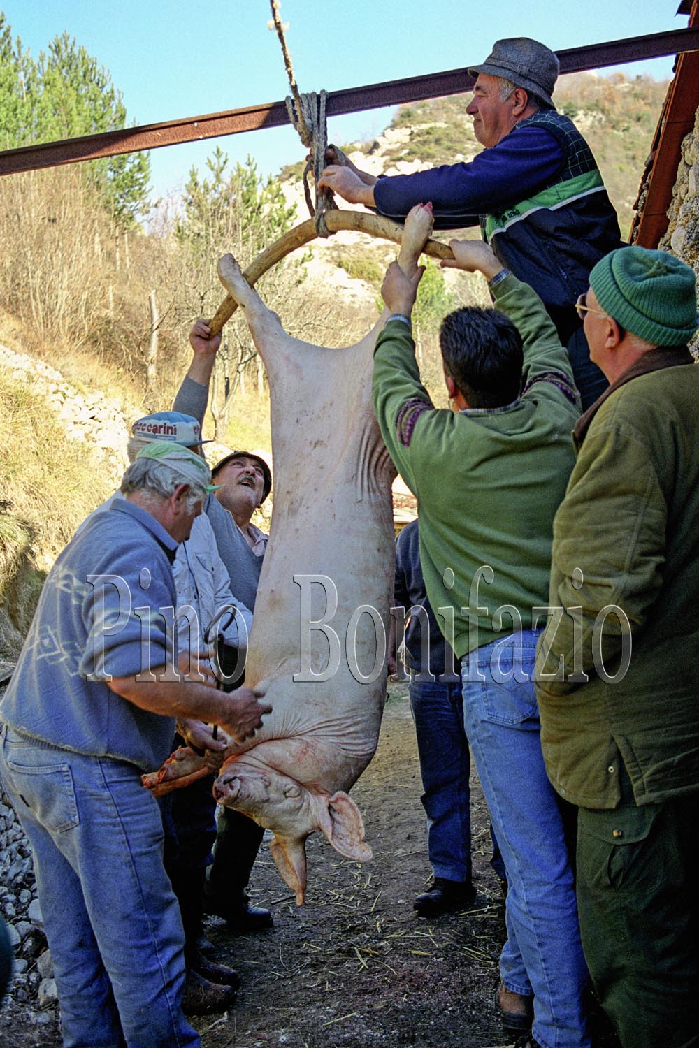 Vallepietra, il maiale è appeso e sezionato.