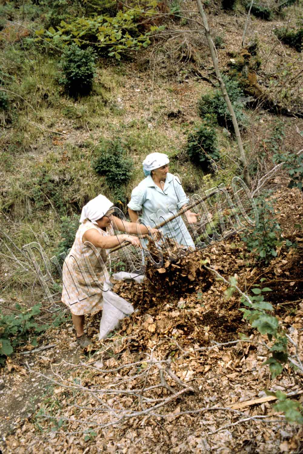 raccolta di foglie secche per coprire tutta la carbonaia.