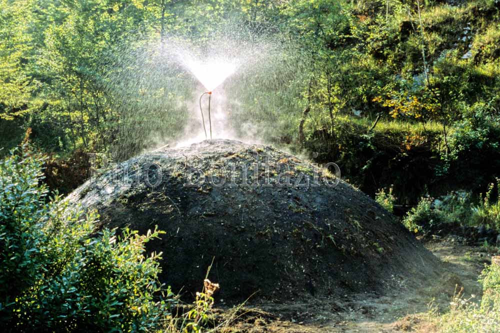 Carbonai di Vallepietra in estate si deve bagnare per compattare la terra, evitando che, polverizzata dal calore, scivoli all'interno.